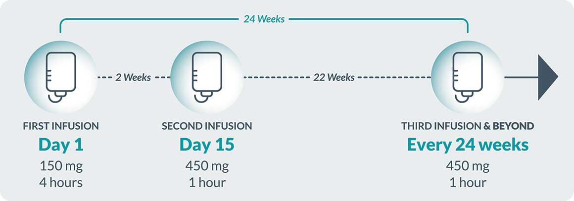 These will be given every 24 weeks (approximately 6 months) following your Day 1 starting dose. These infusions will also last about 1 hour. Post-infusion monitoring is at your healthcare provider’s discretion and is not required after your third infusion and beyond (unless you have experienced an infusion-related reaction and/or signs of hypersensitivity with your current or prior infusions).