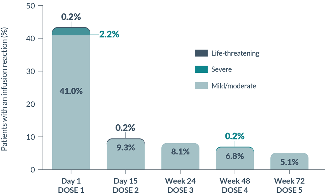 Infusion reactions were mostly mild to moderate and were less common with each infusion