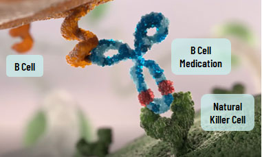 B-cell treatments work by binding to B cells and interacting with natural killer (NK) cells, another type of white blood cell that helps remove B cells from circulation.